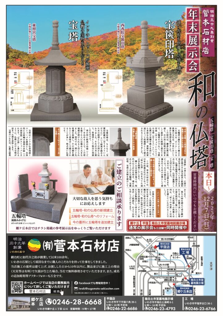 12月7日(日)まで、郷ケ丘店・平窪店・南白土市営墓地展示場の3店舗で「年末墓石展示会」を開催中です。